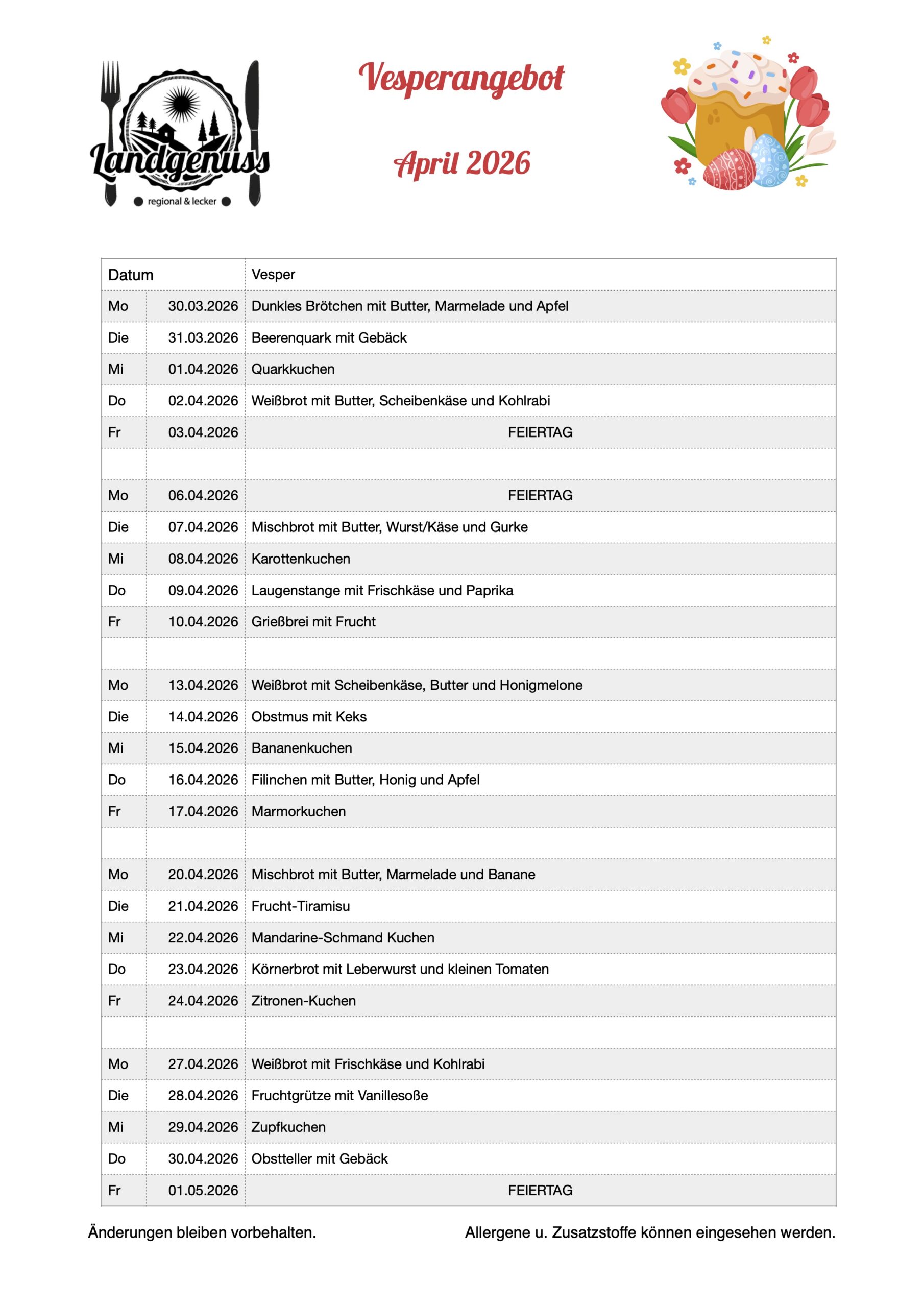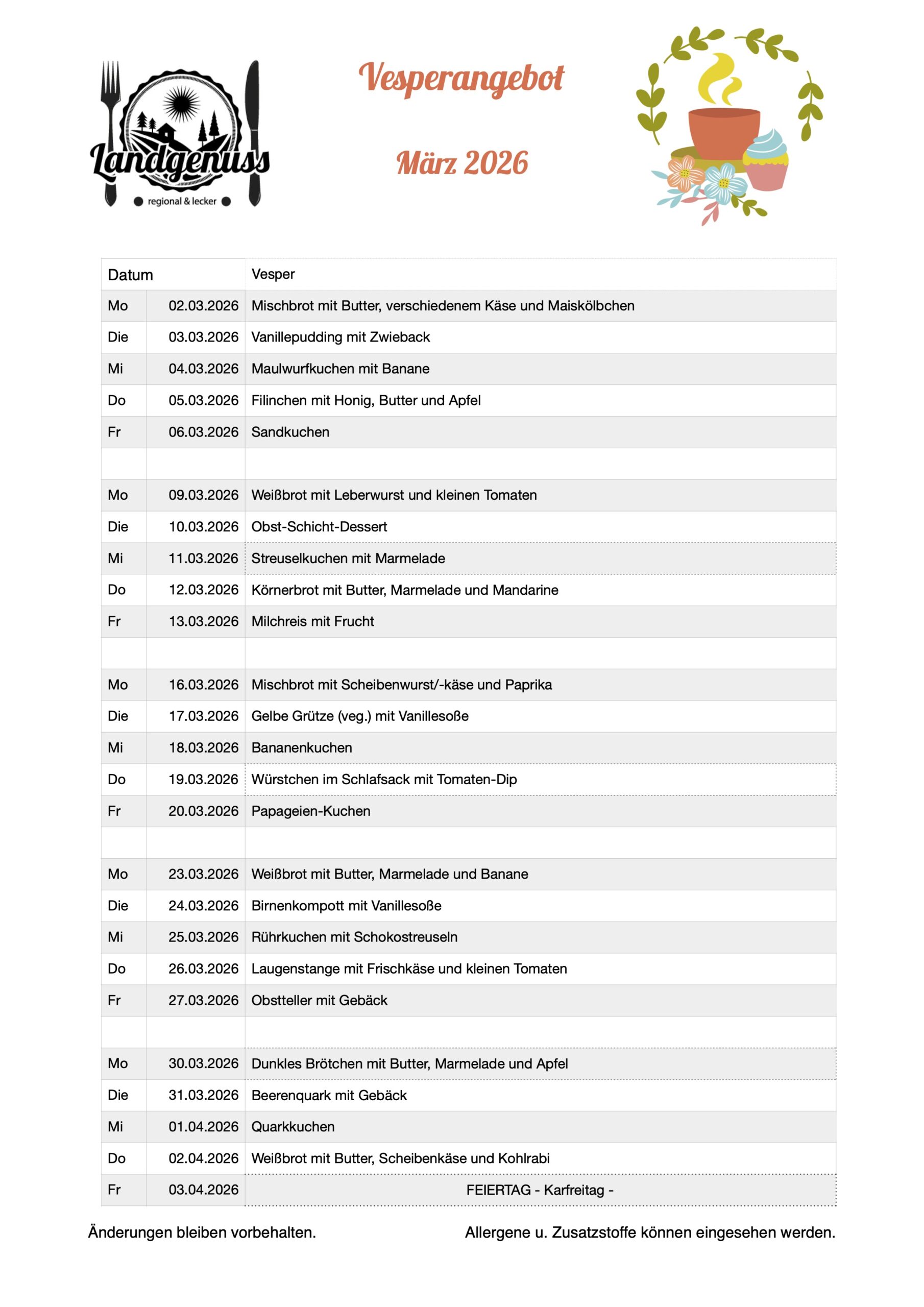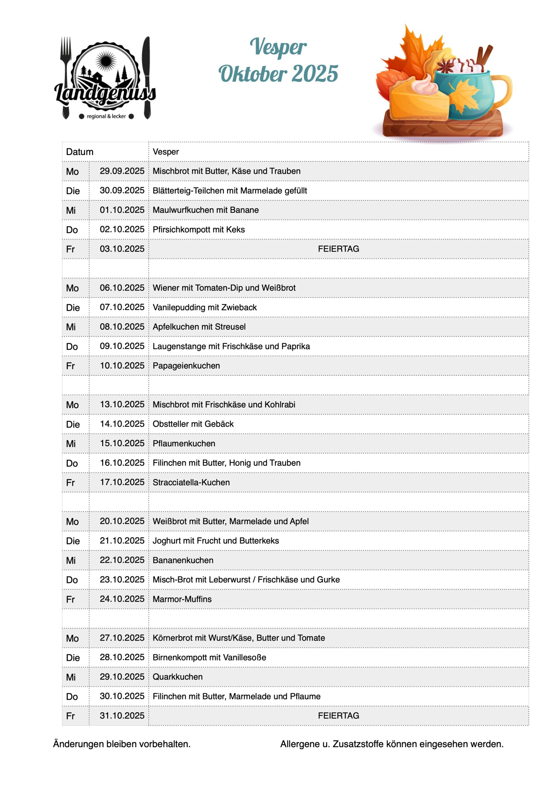Das Vesper, wie das Mittagessen, haben einen monatlichem Plan.