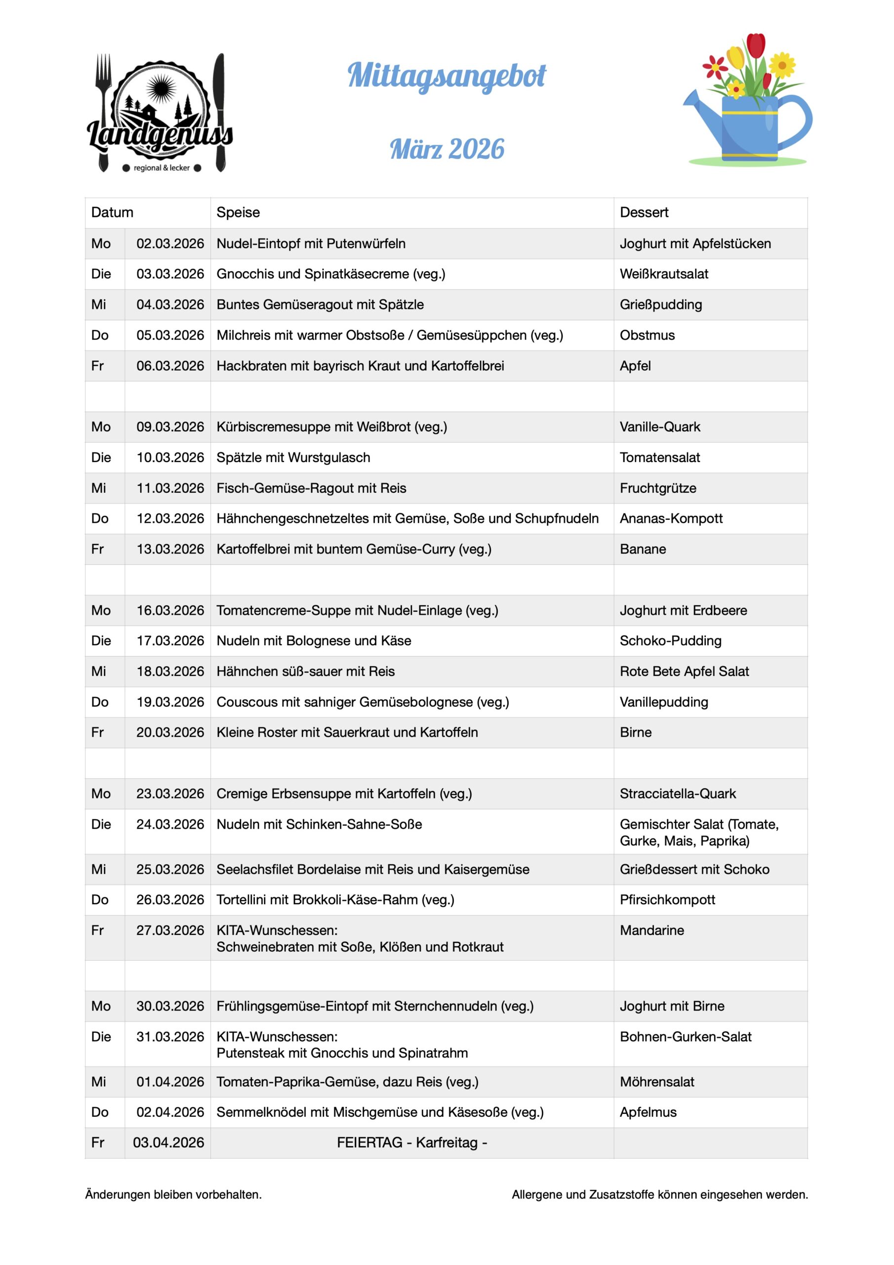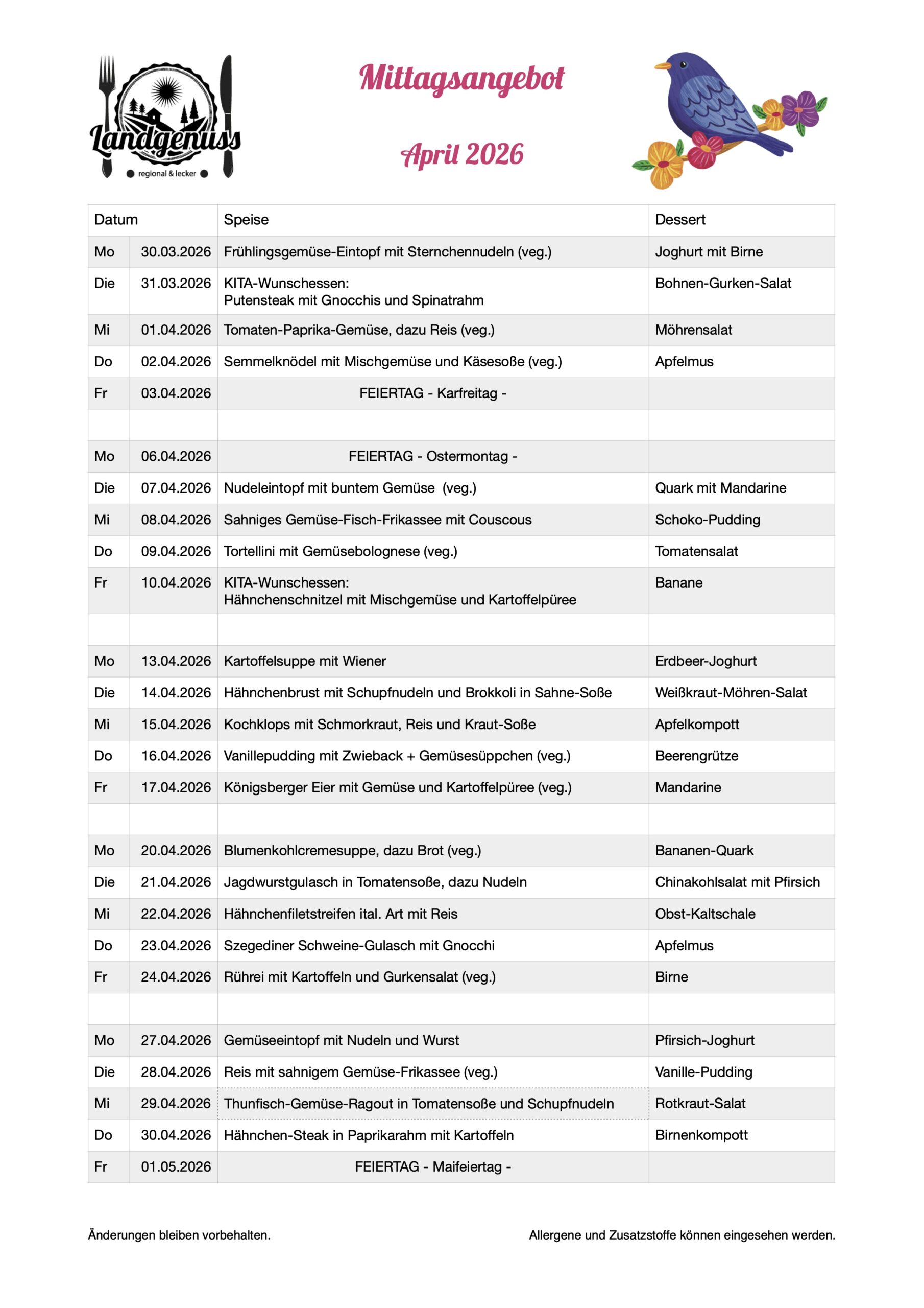 Hier finden Sie unsere aktuellen Speisepläne für Mittagessen- und Vesperverpflegung.