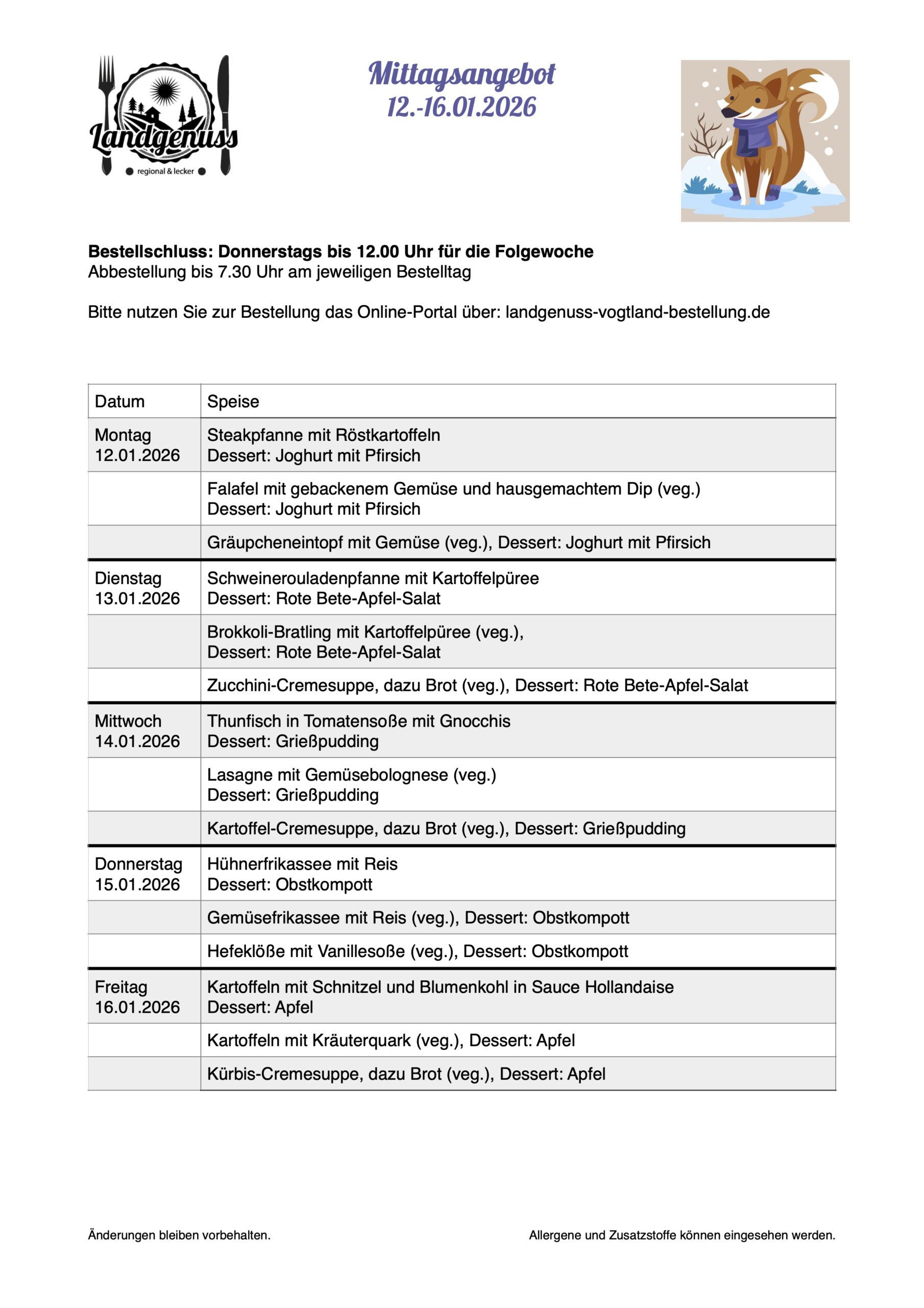Zeige grösseres Bild Schul-Mittagsplan vom 12.-16.01.2026 silvana.hocher2025-12-18T11:22:34+01:00Donnerstag, 18. Dezember, 2025|Plan für Schulen| Teilen Sie diesen Artikel! FacebookTwitterRedditLinkedInTumblrPinterestVkE-Mail Ähnliche Beiträge Schul-Mittagsplan vom 05.-09.01.2026 Gallerie Schul-Mittagsplan vom 05.-09.01.2026 Schul-Mittagsplan vom 15.-19.12.2025 Gallerie Schul-Mittagsplan vom 15.-19.12.2025