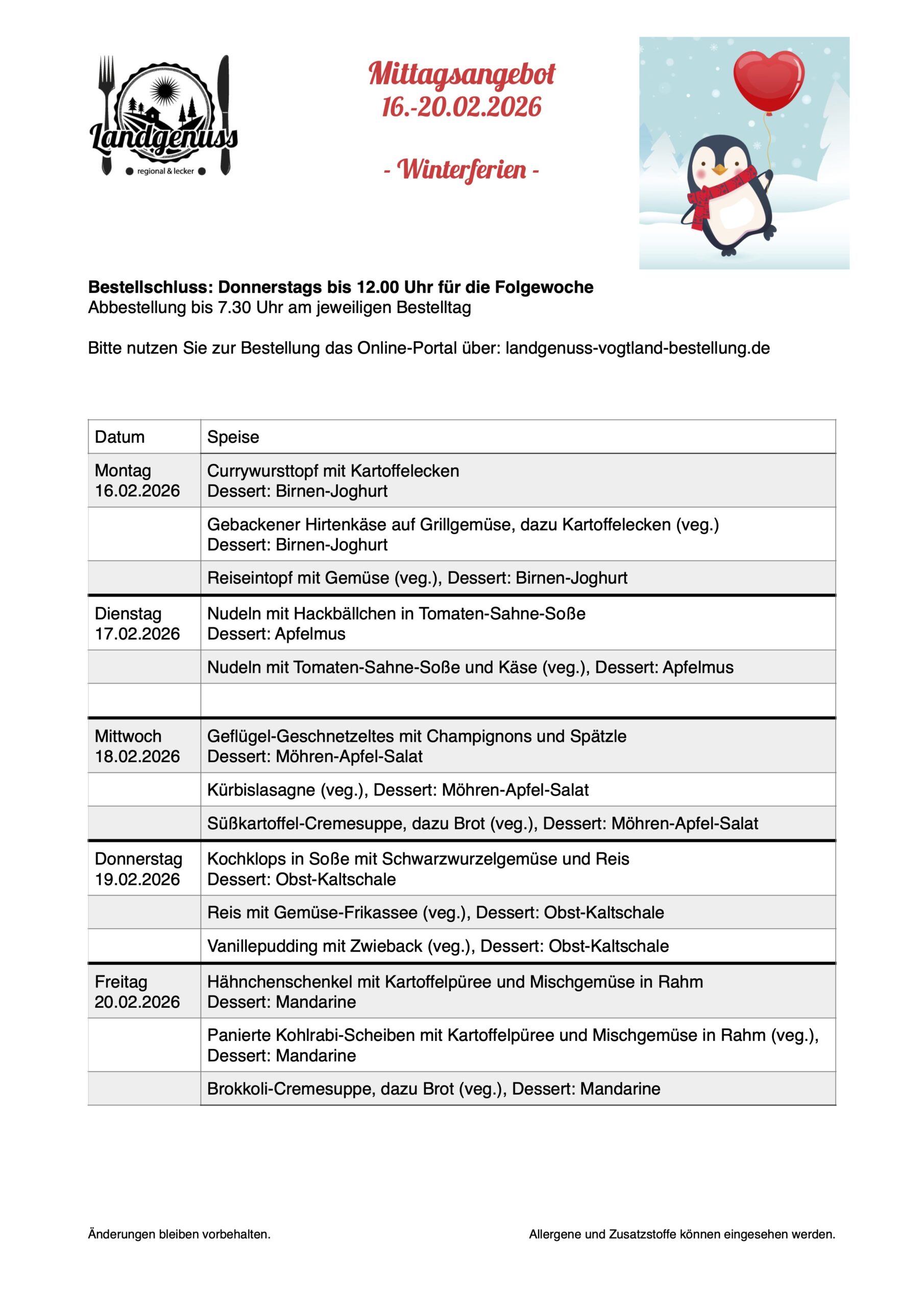 Zeige grösseres Bild Schul-Mittagsplan vom 16.-20.02.2026 – Winterferien – silvana.hocher2026-01-27T09:09:42+01:00Dienstag, 27. Januar, 2026|Plan für Schulen| Teilen Sie diesen Artikel! FacebookTwitterRedditLinkedInTumblrPinterestVkE-Mail Ähnliche Beiträge Schul-Mittagsplan vom 23.-27.02.2026 Gallerie Schul-Mittagsplan vom 23.-27.02.2026