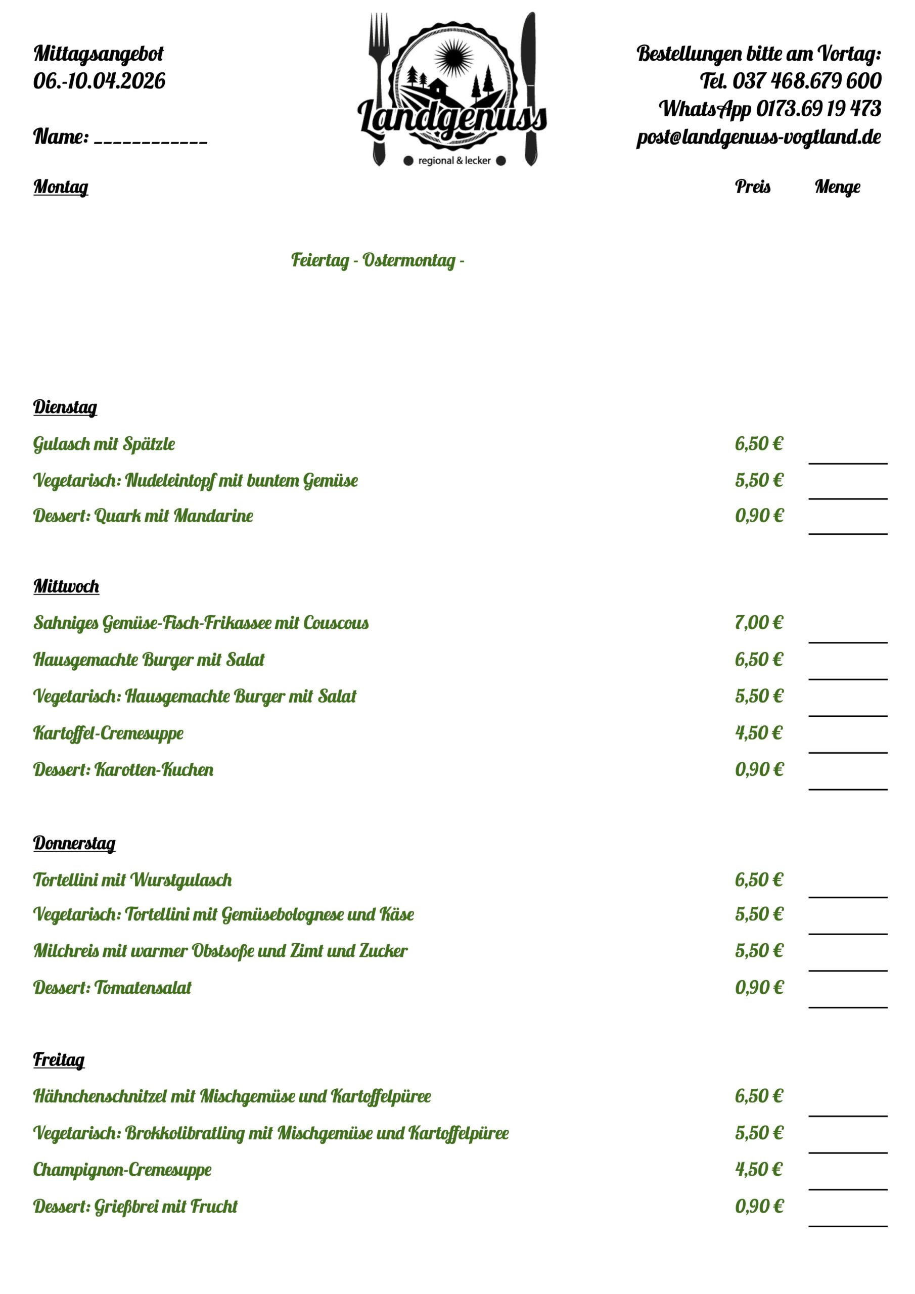 Zeige grösseres Bild Mittagstisch vom 06.-10.04.2026 außer Haus silvana.hocher2026-03-31T12:39:34+02:00Dienstag, 31. März, 2026|Allgemein, Mittagstisch| Teilen Sie diesen Artikel! FacebookTwitterRedditLinkedInTumblrPinterestVkE-Mail Ähnliche Beiträge Mittagstisch vom 30.03.-03.04.2026 außer Haus Gallerie Mittagstisch vom 30.03.-03.04.2026 außer Haus