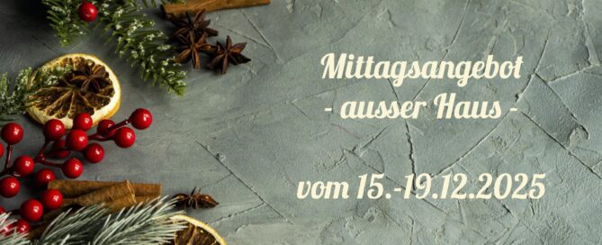 Mittagstisch vom 15.-19.12.2025 zum Abholen oder Liefern lassen Gallerie Mittagstisch vom 15.-19.12.2025 zum Abholen oder Liefern lassen Allgemein, Mittagstisch Mittagstisch vom 15.-19.12.2025 zum Abholen oder Liefern lassen silvana.hocher2025-11-27T13:54:51+01:00Donnerstag, 27. November, 2025|Allgemein, Mittagstisch| Weiterlesen